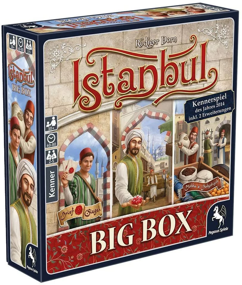 Hustle and bustle in the bazaar district of Istanbul! Merchants and their assistants gather goods at the warehouses and then swiftly transported to the various destinations by the assistants. The goal of the merchants is to be the first to collect a certain number of rubies. Istanbul Big Box combines the base game plus two expansions!