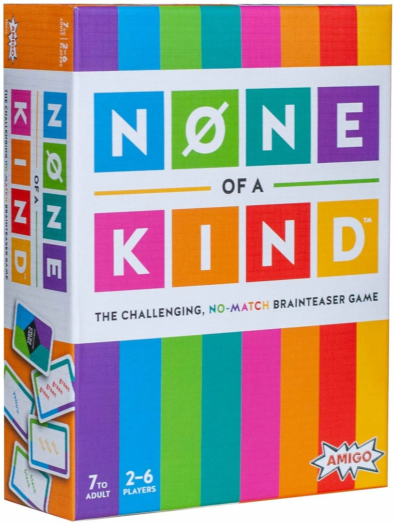 Waitit says `blue,` but it`s printed in red. What`s going on? This multi-player brainteaster game is designed to befuddle, and strenghten your brain. Everyone plays at once as you race to match up cards that don`t matchit sounds easy, but it`s surprisingly challenging. None of a Kind is based on The Stroop Test, one of the most-cited papers in experimental psychology. It studies the relationship between the brains processing speed and executive functions, focusing on regions of the brain involved in planning, decision-making, and managing real-world interference, such as multi-tasking. In other words, playing None of a Kind improves your brains processing speed!