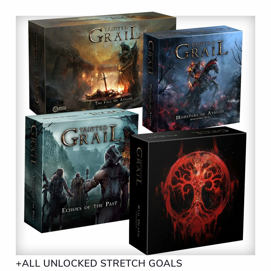 A gameplay all-in Pledge that includes a Tainted Grail: The Fall of Avalon Core Box with all unlocked Stretch Goals, as well as all three gameplay expansions: Monsters of Avalon, Red Death, Echoes of the Past.