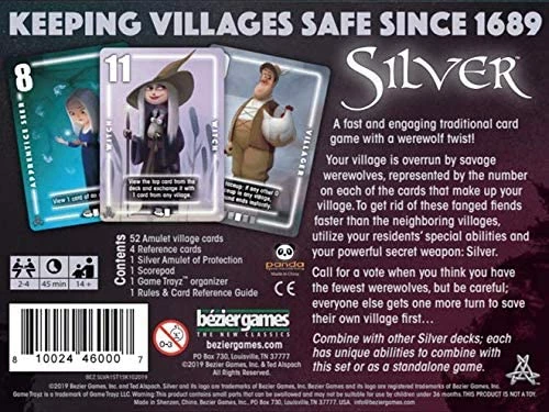 Your village is overrun with werewolves. Tourism is the lifeblood of your usually quiet New England burg, so you`ll need to eliminate them quickly. Your neighboring villages are doing the same, however, so now it`s a race to see which village can get rid of werewolves the fastest. Silver is a fast, engaging card game that you can learn in minutes. Use your residents` special abilities and activate your secret weapon… Silver. When you think you have reduced the werewolf population more than your neighbors, call for a vote; the player with the fewest werewolves wins!