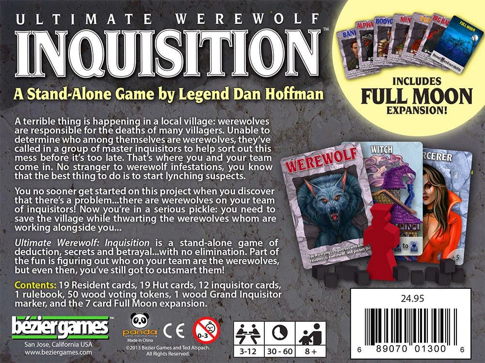 A terrible thing is happening in a local village: werewolves are responsible for the deaths of many villagers. Unable to determine who among themselves are werewolves, they`ve called in a group of master inquisitors to help sort out this mess before it`s too late. That`s where you and your team come in. No stranger to werewolf infestations, you know that the best thing to do is to start lynching suspects. You no sooner get started on this project when you discover that there`s a problem – there are werewolves on your team of inquisitors! Ultimate Werewolf: Inquisition is a stand-alone game of deduction, secrets, and betrayal…with no elimination!