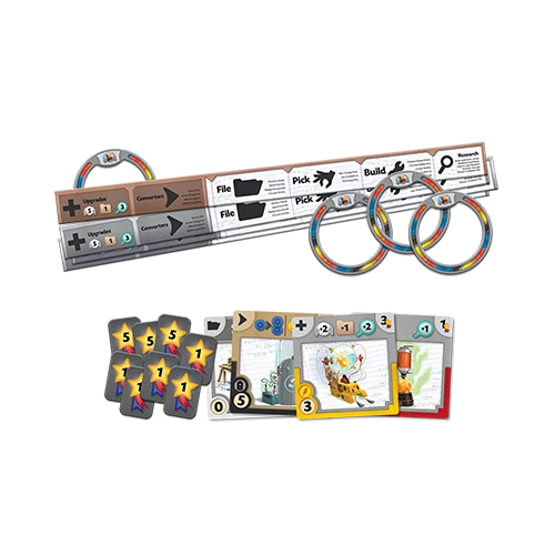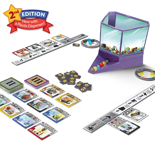 CREATE THE GREATEST GIZMO AT THE SCIENCE FAIR! The sharpest minds of the generation are gathering together at the Great Science Fair. In the end, only one will walk away with the blue ribbon. Who will prove that they’re the best, showing that they can think fast and efficiently build their machines? Only one contestant will rise to the top. In Gizmos, players take on the role of contestants in the Great Science Fair. They will pluck energy marbles from the innovative plastic Energy Dispenser and use them to construct new Gizmos, adding them to their machines. Players will have to plan ahead as they build, since Gizmos can chain-react off of one-another. As more Gizmos are added, more reactions can trigger, creating some truly epic turns. In the end, the player with the most Victory Points is declared the winner.