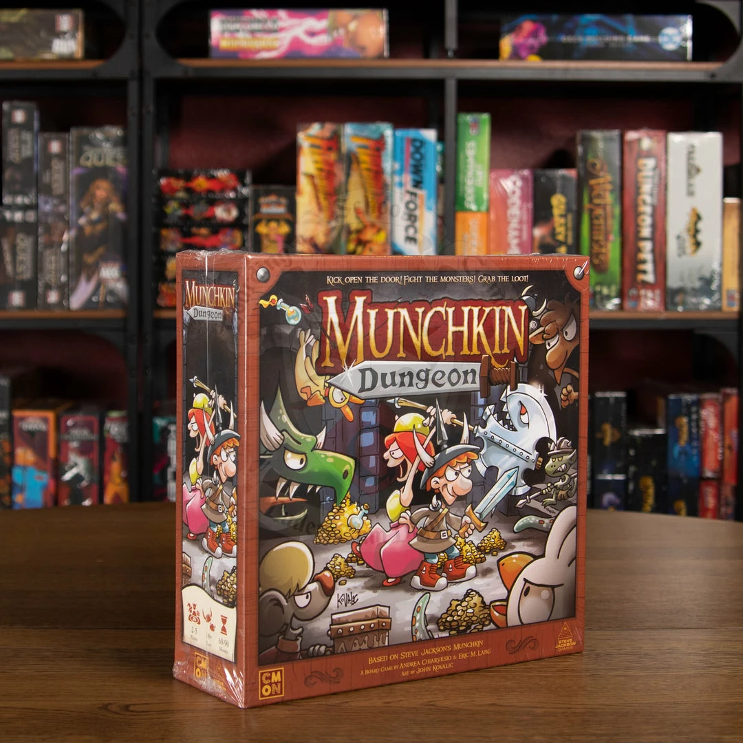 WHO WILL BE THE MOST FAMOUS MUNCHKIN OF THEM ALL? The life of a Munchkin is pretty simple: kick the door open, beat up the monster, take the loot, gain levels, and get famous. Just watch out for the other Munchkins looking to also get that loot. There’s no honor among Munchkins, and they’ll gladly stab you in the back. In Munchkin Dungeon, players take on the role of Munchkins adventuring through a dungeon. Each round, they’ll move down through the dungeon’s different rooms, going as far as they dare before they must face whatever’s in their final room. Other players can then add threats to the fight, making things even tougher. And down at the bottom of the dungeon is the nasty boss. Through all of this (hopefully) players will be gaining loot, levels, and fame. In the end, the most famous Munchkin is the winner.