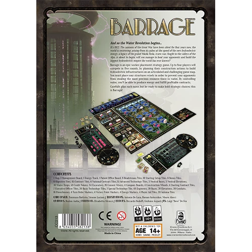 Barrage is a resource management and strategic placement game in which players compete to build their majestic dams, raise them to increase their storing capacity of precious water, and deliver all the potential power through pressure tunnels connected to powerhouse energy turbines. Each player represents one of the international companies who are gathering machineries, innovative patents, and brilliant engineers to claim the best locations to capture and exploit the water power of a contested Alpine region crossed by rivers.