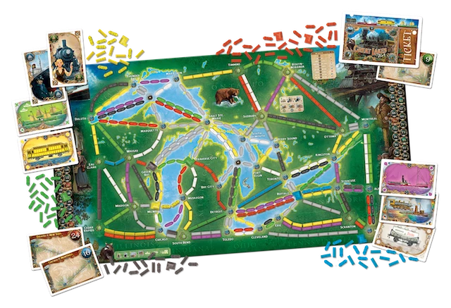 Award-winning for a reason, Ticket to Ride and its expansions take players around the world collecting train cards and building train routes from city to city. Expansions add new game mechanics and introduce players to different countries and continents but the base remains the same, collect cards, complete routes and win with the most points. Rails and Sails includes trains and ships to cross a world map. On the backside, The Great Lakes make use of the ships giving alternative routes instead of only playing on land.