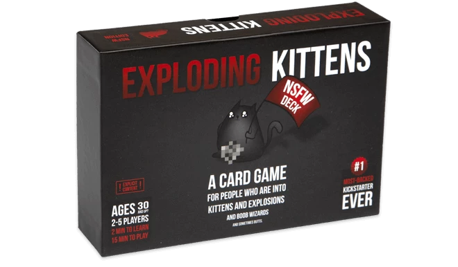 A card game for people who are into kittens… and explosions… and laser beams… and sometimes goats. Exploding Kittens is a highly strategic, kitty-powered version of Russian Roulette. Players try to avoid drawing Exploding Kittens (which boot them from the game) using dirty sasquatch underpants, releasing the torture bunnies, and drinking an entire bottle of bald eagle tears. This game is wonderfully inappropriate, super fun, and easy to learn. The NSFW version of the game contains the full version of Exploding Kittens, but the artwork on each card has been replaced with content deemed `too horrible and amazing` to be used in the standard Exploding Kittens game!