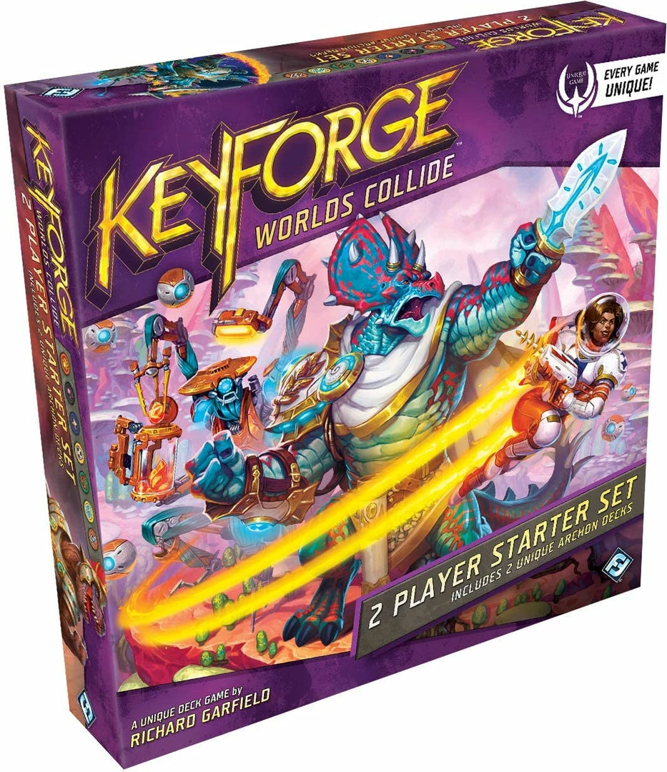 The Crucible is about to be shaken up in Worlds Collide, the third age of KeyForge! In this continuation of the world’s first Unique Deck Game, two brand-new Houses enter the fray as 284 new cards are seamlessly integrated into the existing card pool. With new Houses come more new keyword abilities and new styles of play to create an entirely new collection of Archon Decks for you to discover, explore, and master! The KeyForge: Worlds Collide Two-Player Starter Set provides you with all the tools you need to either begin or expand your adventures on the Crucible, including two unique Worlds Collide Archon Decks, a Quickstart Rulebook, two poster Game Mats, and all the keys, tokens, and chain trackers you and your opponent need to start playing!
