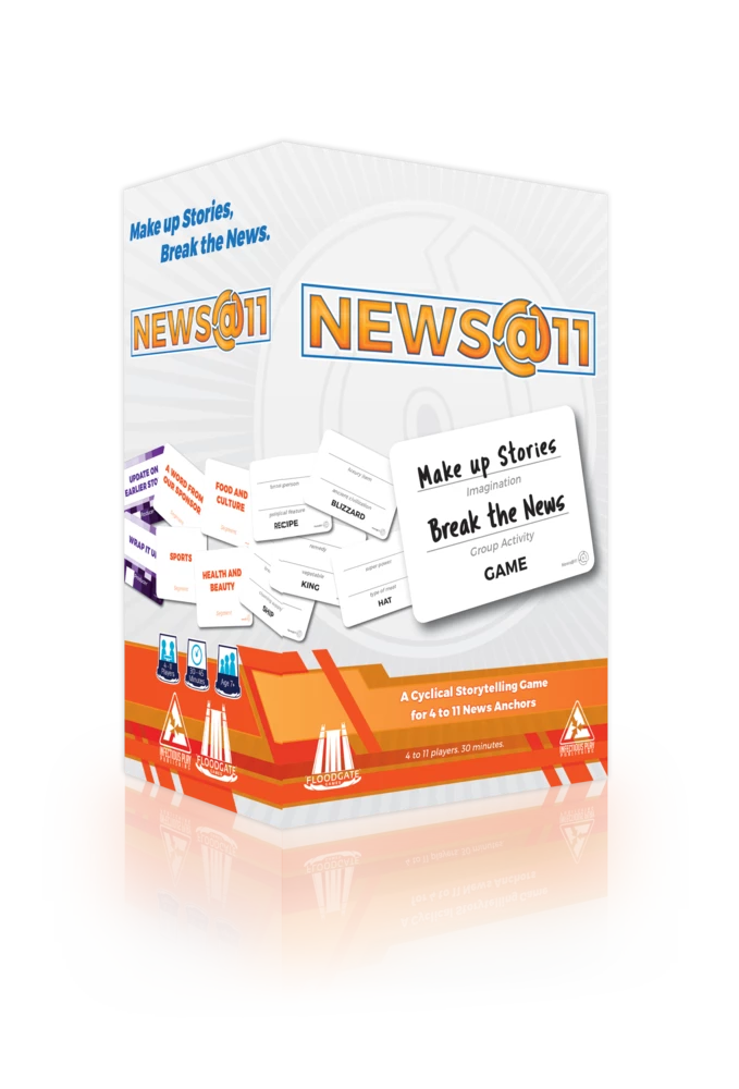 Make up Stories, Break the News! News@11 is a recursive storytelling game in which the players are anchors at a news desk or on assignment in a world going weird. Fill in cue cards and incorporate the topics on them into your segment as you build the story. Stories from the morning news come back in the afternoon and evening, getting stranger and more tangled each time!