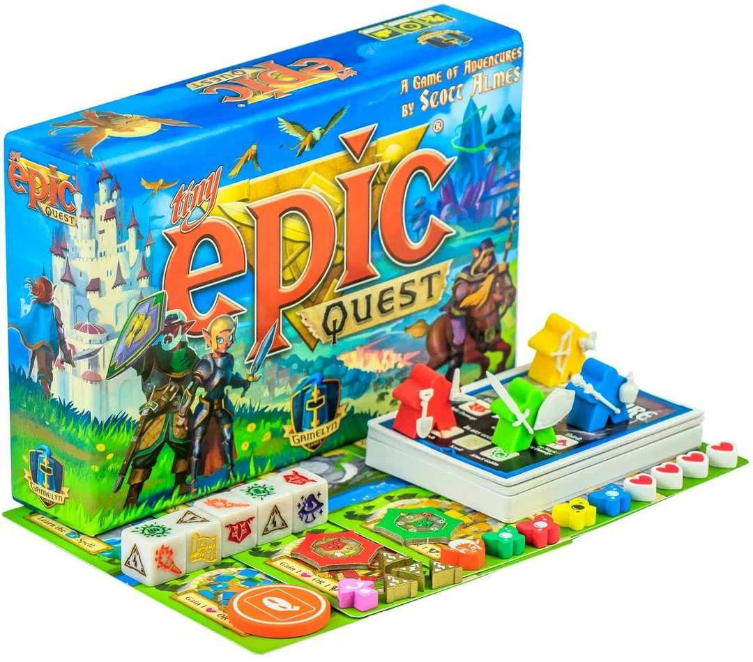 A world of peace has been torn asunder by the opening of a vile portal from the goblin kingdom. Nasty goblins pour into the peaceful groves and villages of the elf world, setting the realm ablaze. Now you, the heroes, must quest in order to right this wrong. There are two paths to victory: closing the portal or slaying all the goblins. Which one will you choose? Either way, your quests will be aided by the help of the surviving mushroom folk and by the epic items that have been lost in the realms deep dungeons. The world is ending quickly, so you must act fast to save it, but you also need to know when your luck will run out. Each round is broken into two phases: day and night. During the day, players travel far and wide, visiting villages to acquire quests, monuments to learn powerful spells, mushroom groves to seek guidance, and treacherous locations in search of artifacts! Acquiring artifacts empower the heroes with unique abilities; this may improve a heroes movement or combat, or their ability to learn spells or mitigate harmful dice rolls. Heroes must travel by foot, by horse, by raft, by boat and by gryphon to get to everywhere they need to go to satisfy their quests or to position themselves for what night brings. As each type of movement is different, and limited, players need to take careful consideration when traveling, and how they travel, if they wish to accomplish all of their goals. During the night, players must face the challenge of their quests, and decisions, by rolling dice, hoping for fortune, and knowing when to quit. Will you press on? Or is it time to save your progress and rest? Tomorrow is another day.
