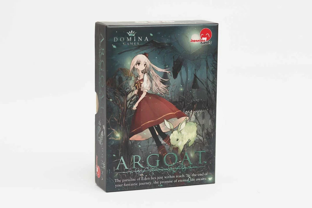 The legendary paradise of Eden is hidden somewhere in the darkness, and if you can find eight hidden pieces of knowledge, you can learn its location and return to this land. In the card game Argoat, the world is built progressively over the course of the game, and you attempt to gather knowledge as new elements appear. Sometimes you`ll have the chance to negotiate with others to obtain this knowledge. The rulebook has rules both Japanese and English, and contains English paste-ups for the cards.
