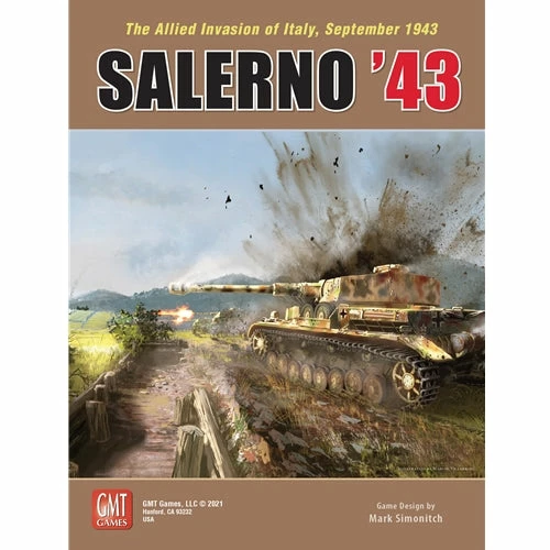 Salerno ‘43 is a regiment/brigade-level game on the Allied invasion of mainland Italy in September 1943. Two British and two American divisions land in the Bay of Salerno defended by the full strength 16th Panzer Division, which is soon reinforced by five other German mechanized divisions. For 8 days the survival of the beachhead is in doubt, and emergency measures are taken to reinforce the beachhead with the 82nd Airborne Division. With their counter-attack stopped and the British Eighth Army approaching from the south, the Germans withdraw their left flank to avoid being trapped. However, their right flank stubbornly holds back the British from pushing north to Naples.