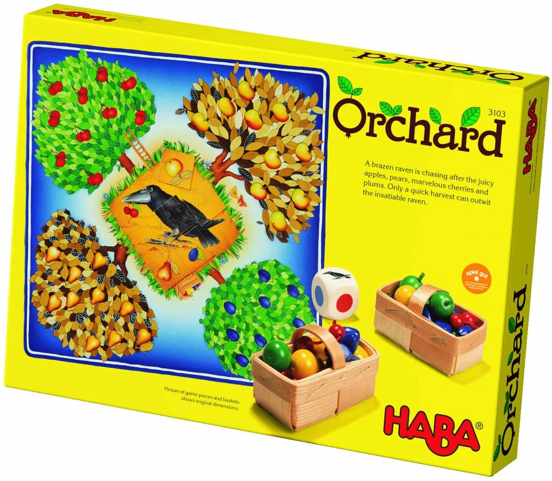 Red cherries, yellow pears, blue plums and green apples hang from the trees in the orchard. The bold raven wants the delicious fruit too. The players must harvest the fruit quickly before the raven can grab it. This is a simple beginning game for children. Each player rolls the die to see which fruit they may harvest with the baskets. Watch out! If the raven is rolled, one more piece of the raven puzzle is built in the center! A great family cooperative game as everyone works together to collect the fruit before the raven puzzle is complete!