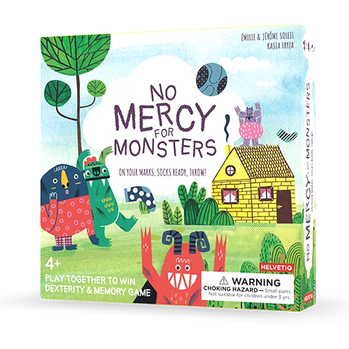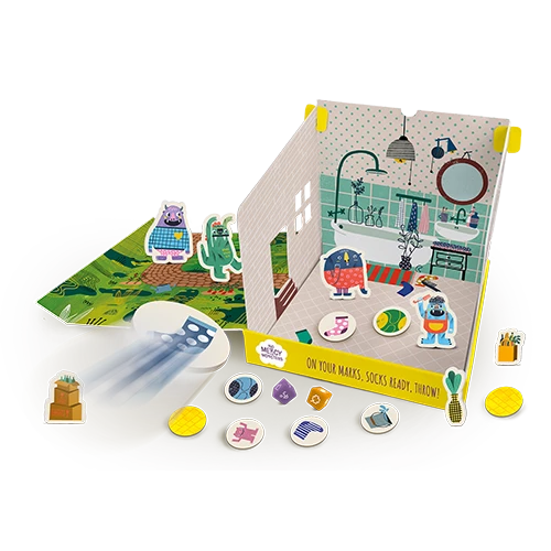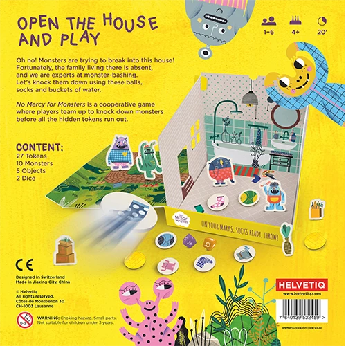 While a family is dining out, monsters are invading their house. Your role? Knock them down before the family comes back. You have a few tricks up your sleeves to counter the spells monsters throw back at you: hit them with socks, aim balls at them and drop bucket of water on their heads. No Mercy for Monsters is a cooperative game where players team up to knock down monsters before all the hidden tokens run out. Open the book, unfold the flaps to build a house and place the monsters around it. You are not playing D&D but to win, you will also have to fight monsters and bring them down — literally. This original concept, and the special actions players must do before throwing the tokens, make it a fun party game for children from 4 years up. Dexterity, memory and cooperation are the key to success.