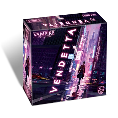 Vampire: The Masquerade – Vendetta is an asymmetrical competitive card game of strategy, bluff, and deduction, designed by renowned game designers Charlie Cleveland (Subnautica) and Bruno Faidutti (Citadels). 3 to 5 players will take control of one of the scheming vampires and fight at several locations to win the support of influential allies and ultimately challenge the throne of Chicago.