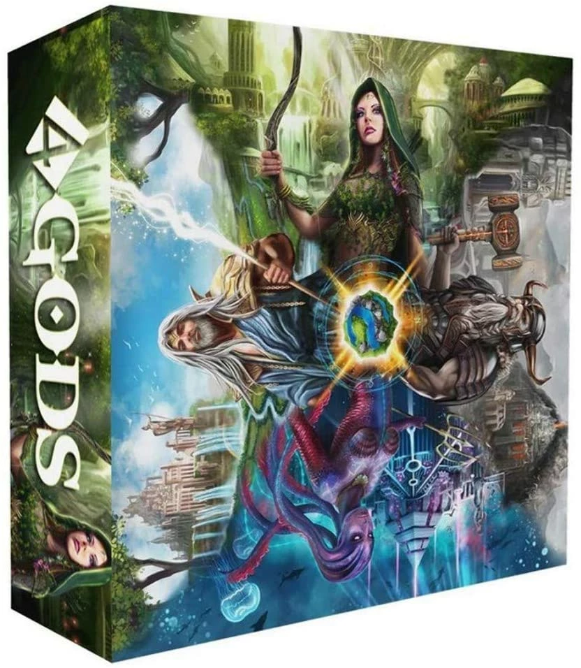 Shape seas, forests, mountains, and plains in 4 Gods, a fast-paced tile-placement game designed by Christophe Boelinger. In 4 Gods, you and your opponents simultaneously create a world’s geography and religious landscape by placing tiles, incarnating prophets, and establishing legendary cities. In the process, you’ll align yourself with the god of dwarves, the goddess of elves, the god of humans, or the goddess of the merfolk. The player whose god wields the most divine influence wins!