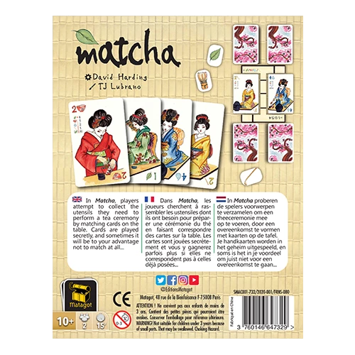 In Matcha, players attempt to collect the utensils (chadogu) they need to perform a tea ceremony by matching tea ceremony (otemae) cards on the table by either their number (1-4) or suit (tea, water, bowl, & scoop.) Cards are played secretly, and sometimes it will be to your advantage not to match at all.