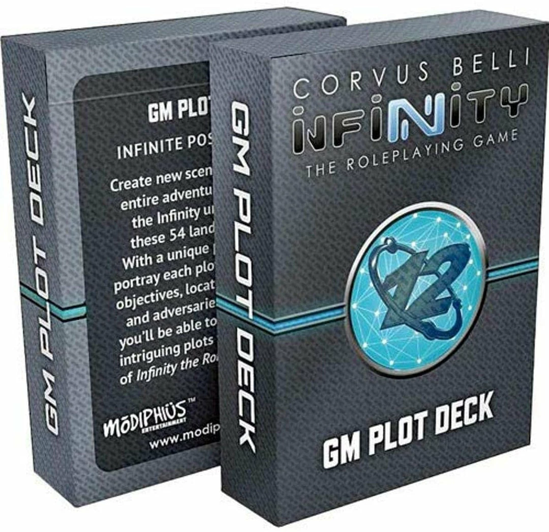 Infinite Possibilities! Create new scenarios or launch entire adventures set within the Infinity universe with these 54 landscape cards. With a unique piece of art to portray each plot, plus example objectives, locations, obstacles and adversaries on the back, youll be able to instantly offer intriguing plots for your games of Infinity: the Roleplaying Game.