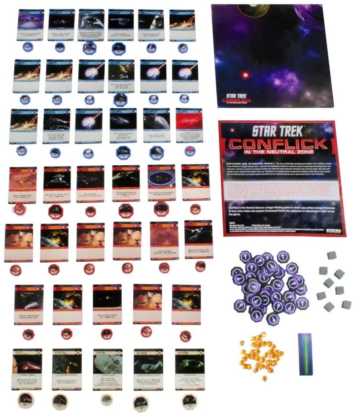 Resource-rich planets have been found in the Neutral Zone and both the Federation and Klingon Empire are out to exploit them! In this simple flicking game, players will flick discs representing the various ships found within the Star Trek universe. These ships are used to collect resources or attack other ships. Collecting resources (energy and command points) is accomplished by bringing a collector ship within range of an energy or command point planet. To attack, you must use your attack ship to hit an opponents ship off the planet or board. Successfully attacking an opponent will award a command point. But attacking isn`t always easy players can add in asteroids in order to block shots and protect their ships.