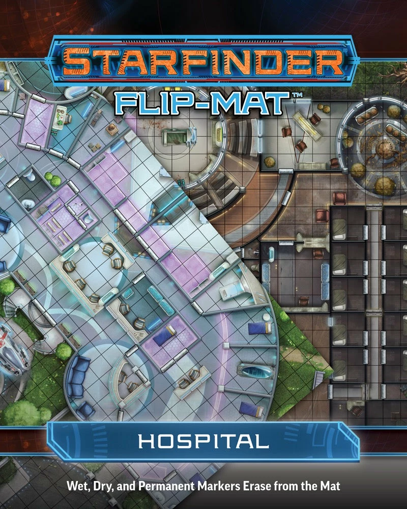 Whether the heroes want to install cybernetic augmentations in their bodies or are searching for the source of an otherworldly plague, no Game Master wants to spend time drawing every nurses station and operating room. Fortunately, with Paizo`s latest Starfinder Flip-Mat, you don`t have to! This line of gaming maps provides ready-to-use science-fantasy set pieces for the busy Game Master. This double-sided map features a futuristic, high-tech medical center on one side and a sinister, abandoned infirmary on the other. Don`t waste time sketching when you could be playing. With Starfinder Flip-Mat: Hospital, you`ll be ready the next time your players need medical treatment for their injuries!
