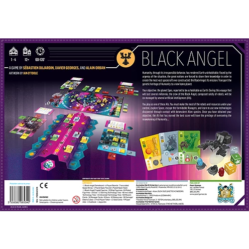 Humanity, through its irresponsible behavior, has rendered Earth uninhabitable. The greatest nations are forced to share their knowledge in order to create the largest spacecraft ever constructed: the Black Angel. Its mission: Transport the genetic heritage of Humanity to a new home planet. Players are the Black Angel’s AIs striving to be the one that oversees the reawakening of humanity once the ship arrives at planet Spes, humanity’s new home. They must make the most of the robots and resources under their control, explore Space, escape the formidable Ravagers, and learn to use new technologies discovered through contact with benevolent Alien species to earn the highest score.