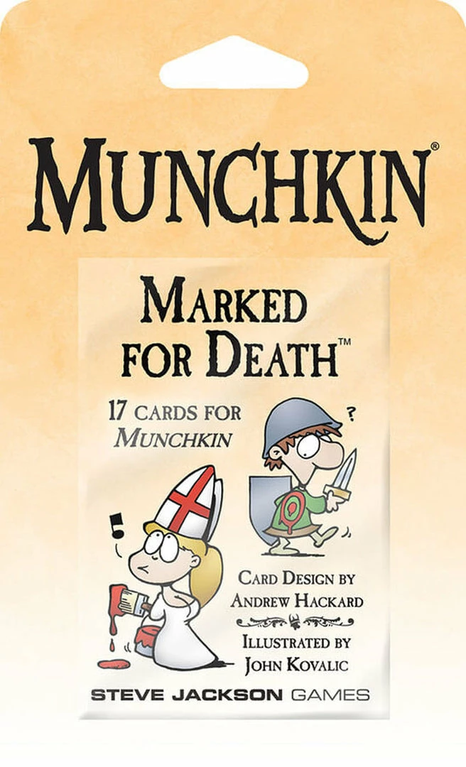 Munchkin Marked for Death is a double-duty booster pack containing 17 all-new cards, including `Anvil`, `Recalculate Your XP`, and the horrifying effervescence of the `Soap Golem`, plus two almost-new cards. And they`re balanced to let you use them as a quick rigged demo for your friends, to get them into the madness that is Munchkin!