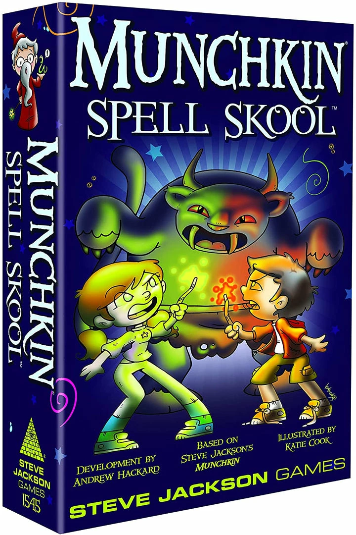 Its the first day at Spell Skool and the munchkins have signed up for class! This game for 3 or 4 eager students is playable on its own and is compatible with the rest of the Munchkin line.Youll want to shelve this one face out; Katie Cooks fantastic art almost sells the game by itself! Students can join fun clubs like the Chess Club or the Forbidden Magic Club and fight enemies such as the Ash Kicker and Moldy Mort on their way to graduation at Level 10.