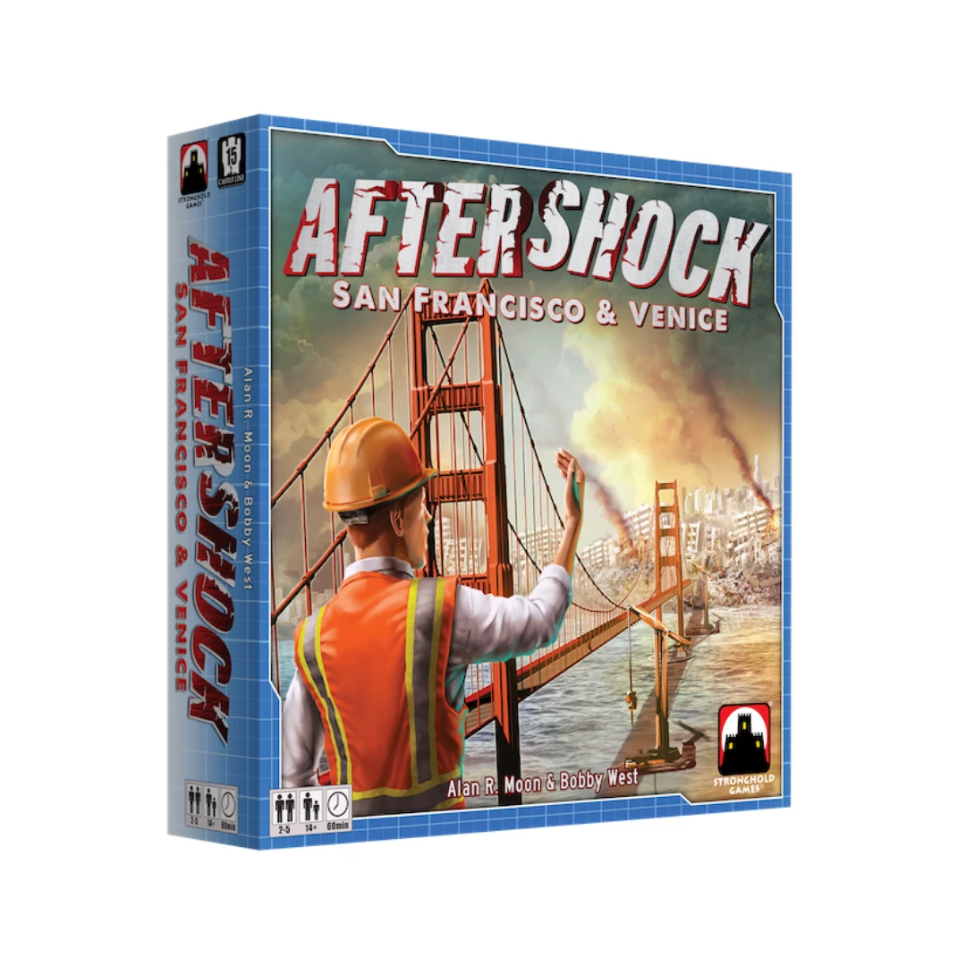 The world has been hit with mega earthquakes. The worst destruction devastated the San Francisco Bay area. It is a time of rebuilding to restore this area to its former glory. Aftershock: San Francisco & Venice is an area control game. Players will spend money to acquire cards, which are used to increase population, build bridges, and determine where aftershocks occur. Negotiate with other players to score areas on the placement board.