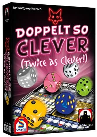 Twice As Clever (aka Doppelt So Clever) follows the model of acclaimed game `That`s Pretty Clever (Ganz Schn Clever`). Each turn the active player rolls six dice, chooses one of them to mark off a space on their scoring grid, places any dice with lower numbers on the side, then re-rolls any remaining dice. The white die is a joker and can be used as any one of the other five colors. After the active player chooses at most three dice, then the other players choose one of the set-aside dice for use on their scoring sheet. This game was designed by award-winning game designer, Wolfgang Warsch!