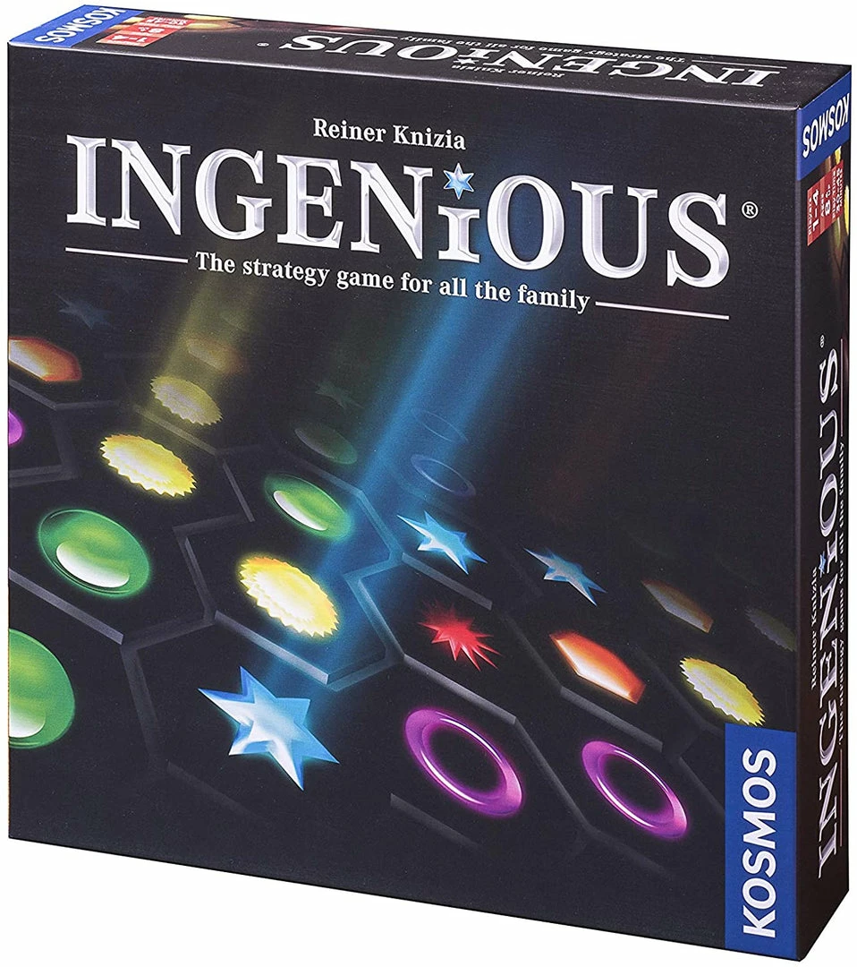 Ingenious is an abstract tile-placement game in which the players take turns placing tiles in the shape of two connected hexagons into a hexagonal grid on the board. The game includes 120 domino-style tiles, each consisting of two hexagons connected along one side. Each hexagon has one of six colored symbols in it, with most tiles having two different colored symbols and some having two of the same colored symbol. This highly awarded, international bestseller has been redesigned with a plastic board.