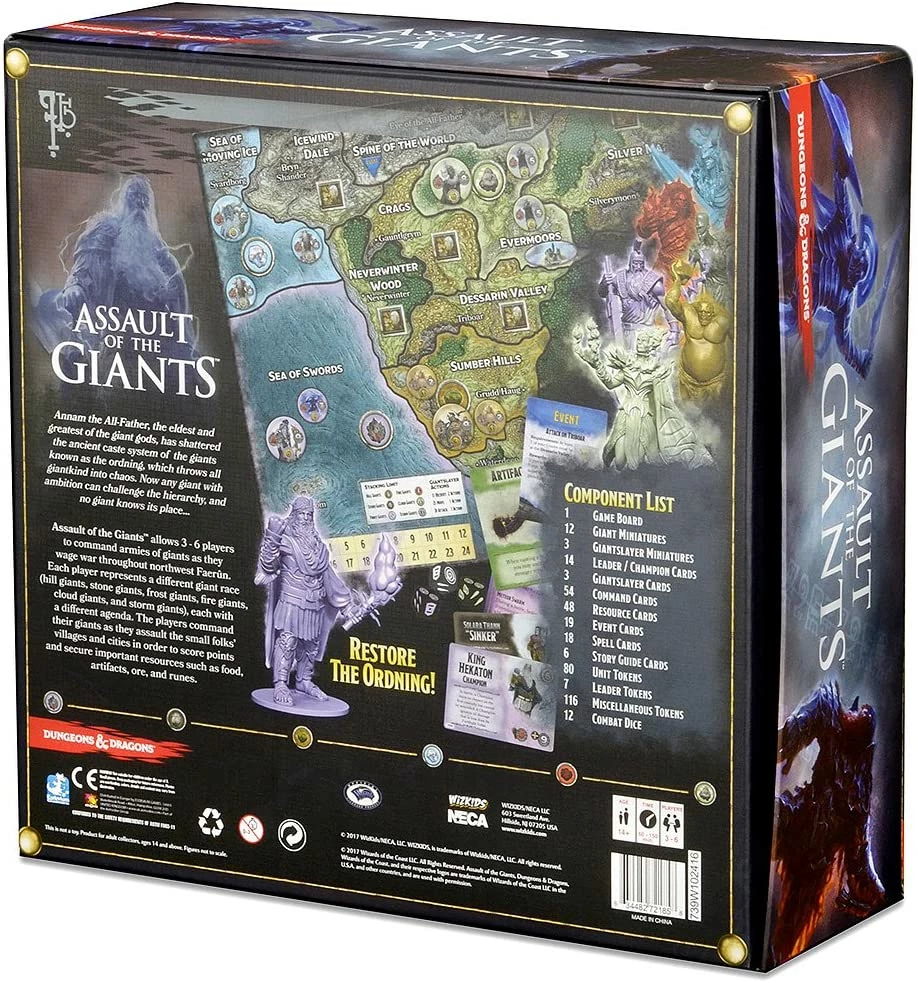 A Dungeons & Dragons board game designed by Andrew Parks, Assault of the Giants challenges 2-6 players to command one of the six types of giants and claim the right to rule over all giantkind. Command giants and assault settlements to score points and secure important resources, including food, treasure, ore, and runes. Also, pursue special agendas based upon their race – Storm Giants seek to restore their lost monarch, King Hekaton, Cloud Giants covet an ancient dragon treasure trove, and Hill Giants crave an abundance of food with which to feed their massive leader, Chief Guh.