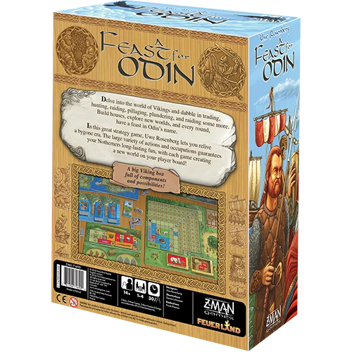 In this epic game, command a band of Vikings to trade, hunt, raid, pillage, and plunder in search of wealth and glory for your tribe. A Feast for Odin is a saga in the form of a board game, from acclaimed designer Uwe Rosenberg. In this strategic worker placement game for one to four players, you will experience the Viking way of life. Each player explores new territories—and raids the villages they find there—to increase their wealth and glory, while also taking part in day-to-day activities such as gathering food to feed their band of hungry Vikings. In the end, the player whose possessions carry the greatest value is the winner.
