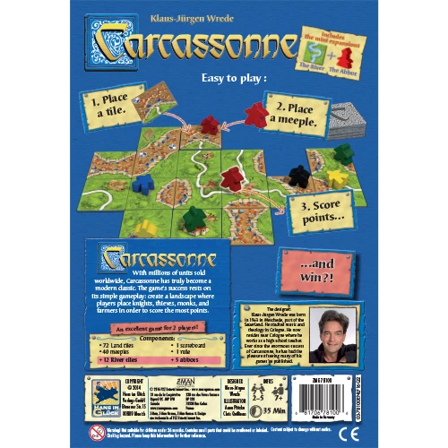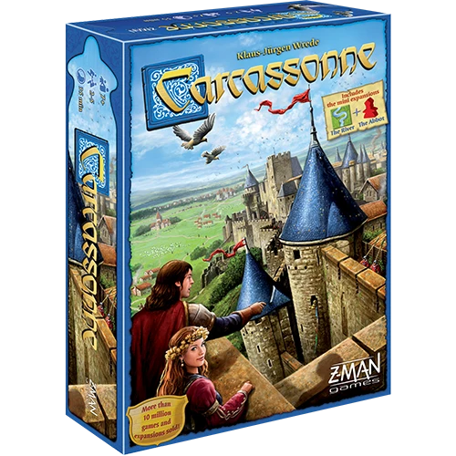 Inspired by the medieval fortress in southern France of the same name, Carcassonne is a tile-laying game in which players fill in the countryside around the fortified city. Players choose from tiles that depict cities, roads, monasteries, and fields; each new tile placed creates an ever-expanding board on which players can then add their followers. Players score points by having followers on features as they’re completed. The player who makes the most strategic placements of tiles and followers will score the most points and win the game. With its simple yet rich game mechanics and eighty-four tiles that can be configured into numerous combinations, Carcassonne appeals to beginners and veteran gamers alike. This edition is entirely redesigned and modernized, and includes two expansions: The River and The Abbot.